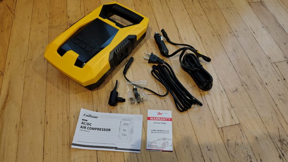 まあまあ良さそうだったと、セール品だったのでオーダー。翌日の朝、早速到着したので使ってみることにした。到着した電動エアコンプレッサーに入っていたのは以下の通り。