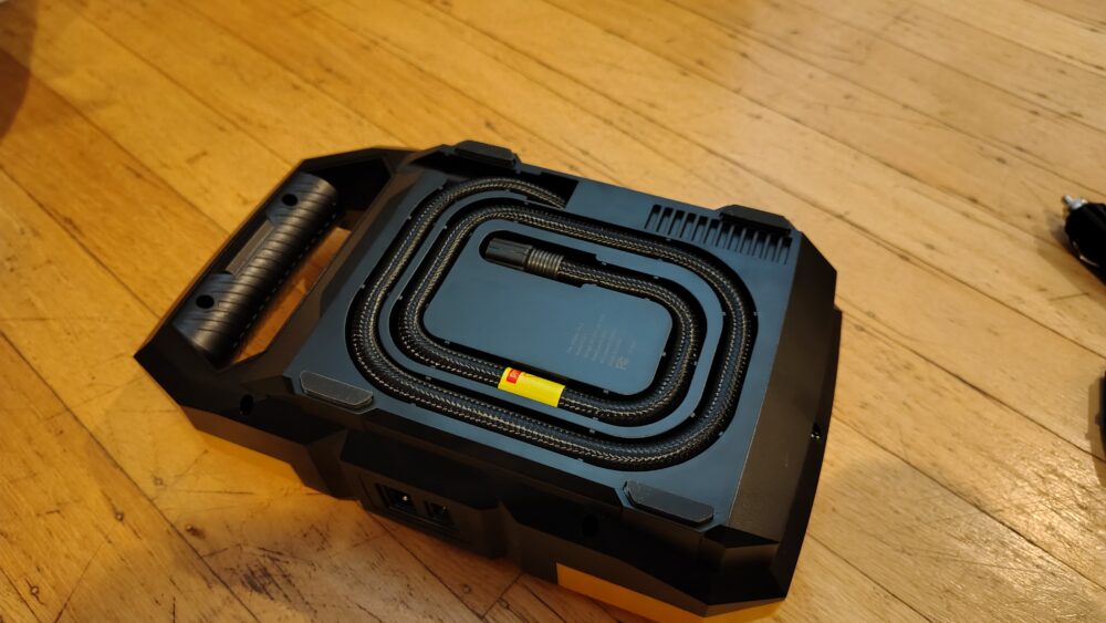 家庭用コンセント110Vに接続する電源ケーブルと、車のシガーソケットから電源を取るためのケーブル、およびボールや自転車のタイヤなどに対応するためのアダプターがセットになっていた。家庭用コンセントと、シガーソケットどちらの電源でも使えるため便利だ。なお、電動エアコンプレッサー本体裏側から、車の空気バルブにつながるホースが伸びている。