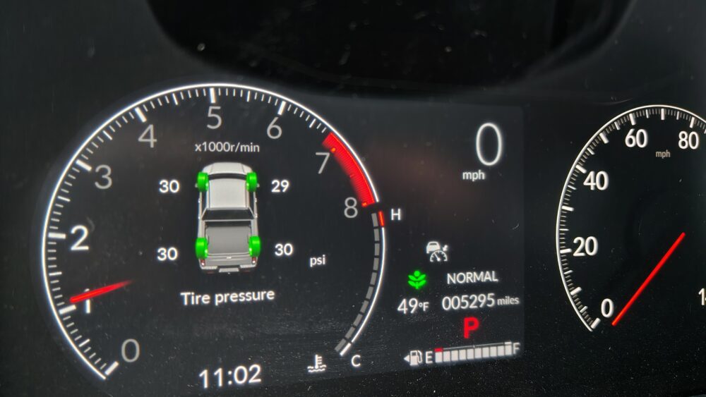 私の住むカリフォルニア北部でもここのところ冷え込んできたので、タイヤ空気圧をチェックしてみた。最近は便利で、タイヤ空気圧監視システムの空気圧監視機能がついているRidgelineのもので、メーターディスプレイで現在の空気圧を知ることができる(モデルによっては、空気圧が低くなったら警報を出すだけのものもある)。
