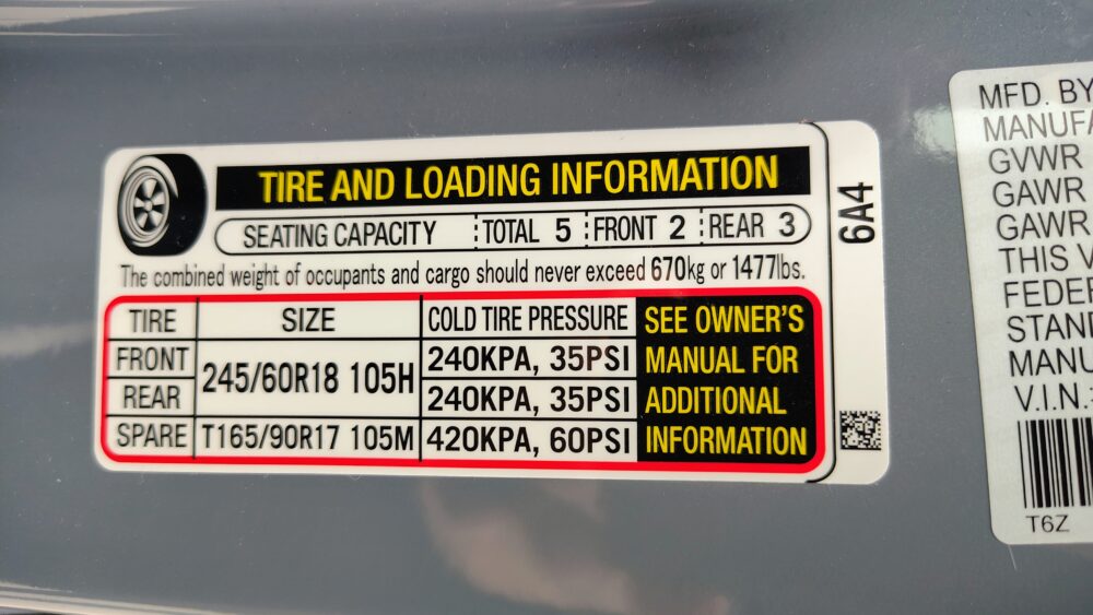空気圧の基準値は車とタイヤサイズなどにより異なるが、適正値を知るには運転席のドアを開けてBピラーをみるとステッカーが貼ってあるのが一般的。