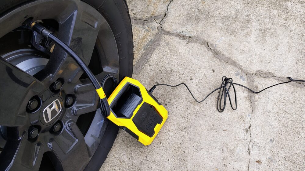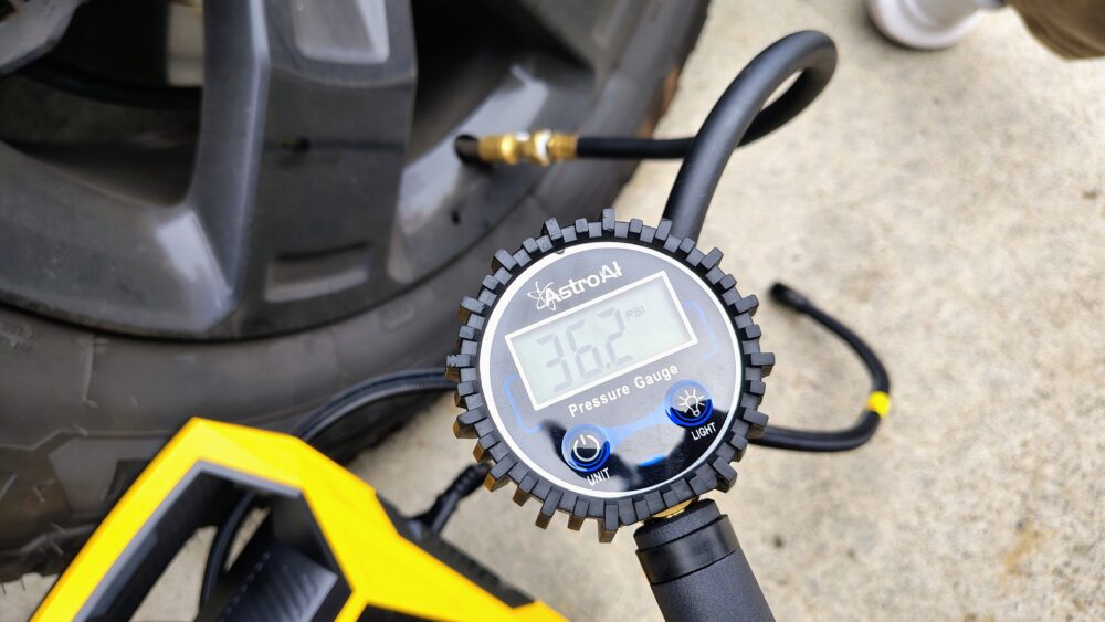 希望エア圧(ここでは35PSI)をセットして、スタートボタンを押すと自動で空気が入る。この時、電動コンプレッサーの作動音はかなりうるさいモデルが多い中、これは割と静かな方だった。