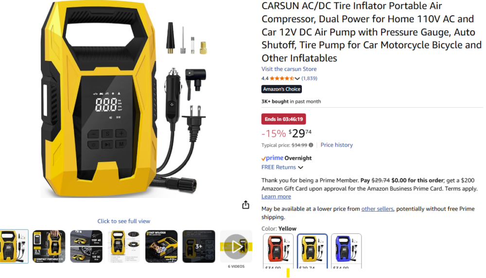 アメリカに引っ越してきた際には、日本のガレージにコンプレッサーを置いてきたので、純正パンク修理キットに付属のコンプレッサーを使っていたものの、音がうるさいのと、使い勝手もあまりよろしく無い。わりと使用頻度が高いため、流石に面倒になって、今回購入するに至った。ということで、今回はアメリカのAmazonで格安で販売していた電動エアコンプレッサーを買ってみることにした。下がその商品で夜9時にオーダーすると、プライム便だと翌日朝には配達されるようだ。