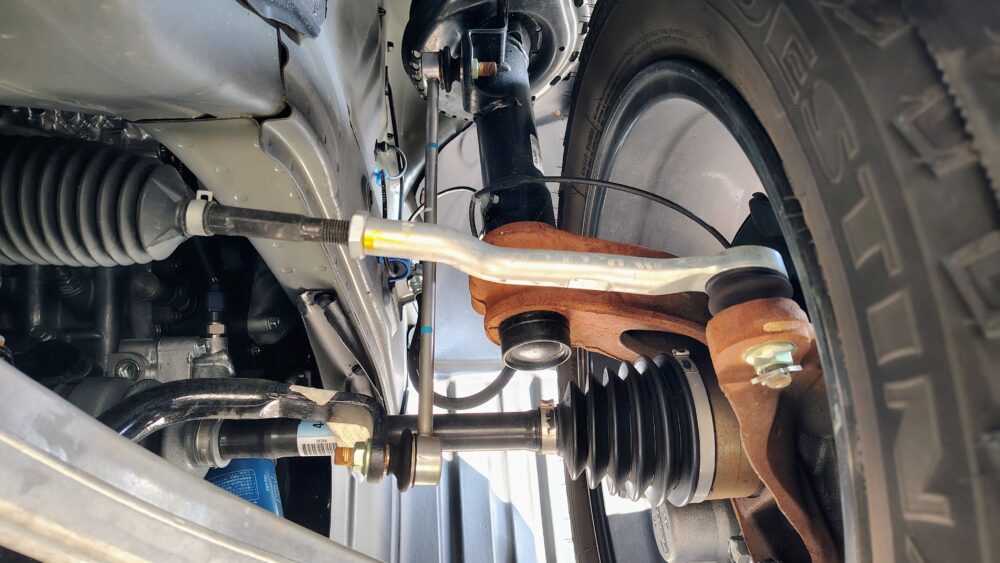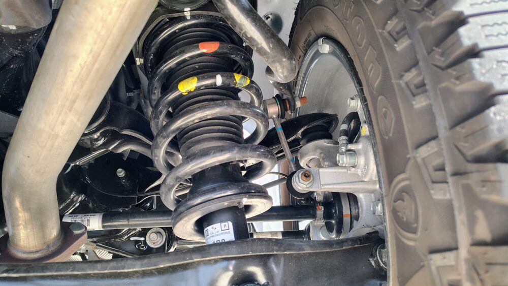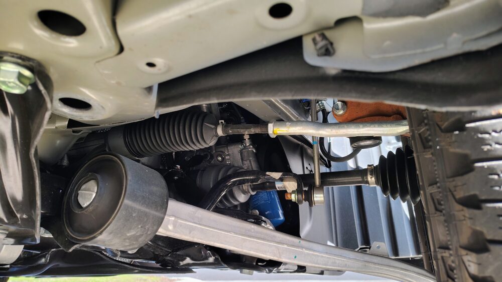独立懸架サスペンション。フロントのサスペンションはストラット。教科書に載っているお手本のようなレイアウト。ただし、重量のあるトラックなので、アーム類はそれなりにデカい。購入して数カ月、走行距離数千マイルでサビがついている。当然メーカーはテストしているし、そもそも金属は錆びるものだし、表面だけだろう。そして、アーム類は10年以上経って腐食が進んだら必要に応じて交換するから機能的には全く問題ないため、自分は全く気にならないが、アームに防錆塗装してくれていると見栄えがいいんだけどね。